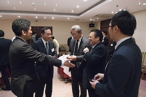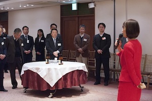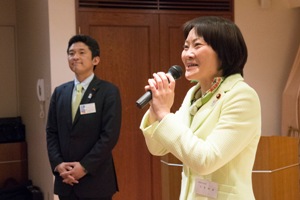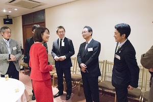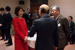 18時30分、二島会長から日頃の感謝の言葉で懇親会はスタートしました。昨年の突然の解散・総選挙によって延期になっていたため、約4か月振りの会合となりました。今回は厚生労働大臣政務官の丸川珠代参議院議員、昨年末の選挙で見事初陣を飾られた山田美樹衆議院議員を交え、懇親を深めました。また、当会の顧問である国土交通副大臣である梶山弘志代議士の代理として木村政策秘書も駆けつけて下さり、副大臣からのメッセージも披露してくださりました。今回は、北里大学、慶応大学、明治学院大学の学生ボランティアの方に受付や電報披露などご協力いただきました。学生のみなさんも輪に入って戴くことが出来、新たなつながりも感じられた2時間でした。皆様ありがとうございました。(事務局)